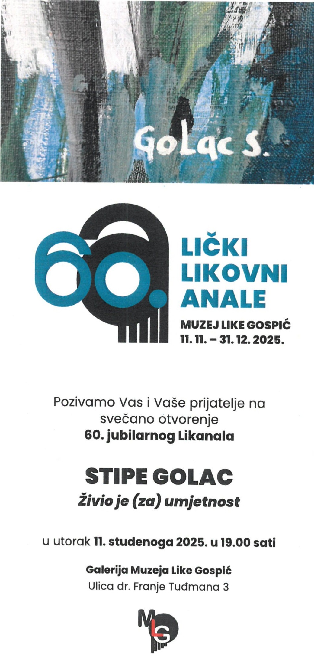 Povodom obilježavanja 60. jubileja osnutka Ličkog likovnog anala (ili Likanala), jednog od najpoznatijeg kulturnog događaja u Gospiću, pa i šire, Muzej Like Gospić priredio je izložbu pod naslovom Živio je (za) umjetnost Stipe Golca (1939. – 2018.) koja će se održati u utorak 11. studenoga u 19 sati u Galeriji Muzeja Like Gospić. Izložbom se obilježava i 25. obljetnica od umjetnikova prvog izlaganja na Likanalu, na kojem je sudjelovao najduže od svih dosadašnjih 426 autora. Uz to, ovaj slikar, koji dugi niz godina djeluje kao pedagog i književnik, bio je jedan od začetnika Likanala (1966.), tajnik njegova organizacijskog Odbora (1971. – 1983.) i predsjednik (1983. – 1986.), kao i ključna karika u stvaranju Galerije umjetnina u Muzeju Like Gospić.U znak sjećanja na umjetnika i njegov trajni doprinos kulturnoj baštini Gospića, izložba obilježava slavljenje života i djela jednog od značajnih hrvatskih umjetnika, Stipe Golca, u njegovom gradu. Na taj način izložbom odajemo počast Stipi Golcu i njegovu predanom radu, istraživačkom duhu i ljubavi prema ljepoti umjetnosti za koju je živio.Koncepcija izložbe donosi retrospektivni pregled Golčeva stvaralačkog opusa, s naglaskom na evoluciju umjetničkog izraza, kroz više od pet desetljeća. Umjetnik se predstavlja s 53 izabrana rada iz obiteljske ostavštine, u kojima dominiraju spektralne čiste boje, suvremene slikarske forme ekspresivnog izričaja i zavičajni motivi koji evociraju sjećanja, emocije i ritmove Like i Velebita. „Slikajući zavičajne motive, Golac nas je prošetao krajolicima, atmosferom koja potiče i koja se osjeća jer njegova je osebujnost imala potrebu polučiti slike i sekvence vlastitih svjetova.“, istaknula je u predgovoru kataloga Vesna Bunčić, muzejska savjetnica i autorica izložbe.Grafičko oblikovanje i pripremu kataloga izradila je grafička dizajnerica Ivana Pavičić, dok je fotografije snimila Tajana Maras, muzejska tehničarka. Izložba je organizirana uz financijsku potporu Ministarstva kulture i medija Republike Hrvatske.Izložba će biti dostupna za razgled do 31. prosinca 2025.