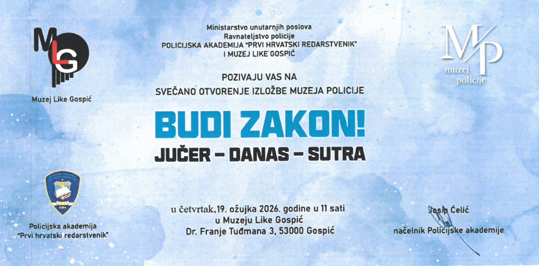 Muzej Like Gospić poziva Vas na otvorenje izložbe BUDI ZAKON! Jučer – danas – sutra u organizaciji Muzeja policije i Muzeja Like Gospić u četvrtak, 19. ožujka 2026. u Malom salonu Muzeja Like Gospić.